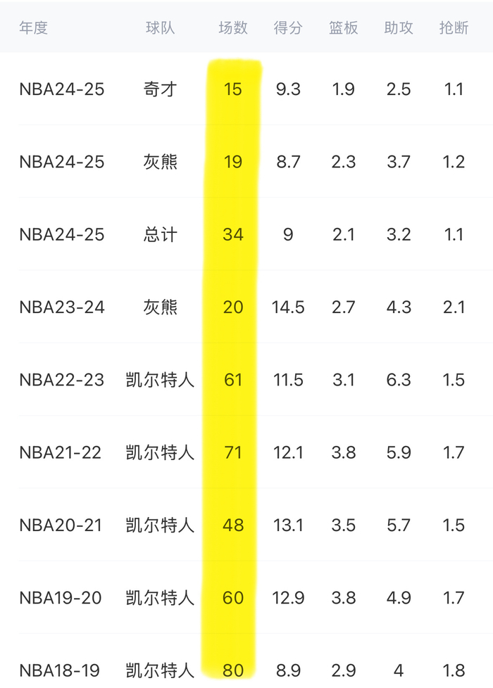 01 过去3个赛季,因为伤病,他分别只出战了19,34和20场比赛,出勤率着实让人担忧。新赛季他的首要任务是保持健康,保证出勤率,不然都是白搭。